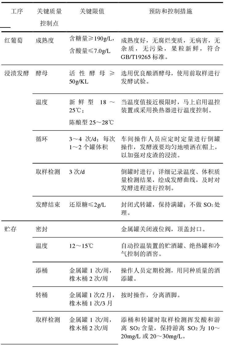 干红葡萄酒酿造中关键质量控制点及主要技术参数