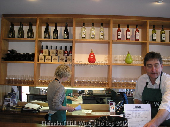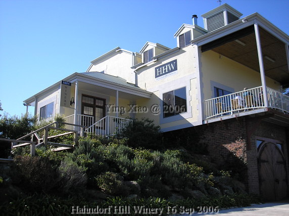 这位接待先生介绍道,HHW有15年的葡萄栽培历史,三年前开始经营Winery。他告诉我们,可以从HHW的酒瓶形状来判断酒的酿造情况。如果瓶身是圆柱形,那就是在Stainless Steel Tank(不锈钢罐)里发酵的,没有橡木桶过程,几款白葡萄酒就是这样;而圆锥形的瓶身则有在橡木桶里发酵,如oaked Chardonnay和红葡萄酒。我们边品酒边与他交流。朋友问及海外市场的情况,他回答说,在美国、马来西亚、波兰和香港地区都有销售。另一朋友与他探讨酿造的过程,free run在新桶里发酵;pressed juice在两年的桶里发酵,然后混合。接待的先生说,葡萄施行限产措施,说在转色期后疏掉部分果实。人工修剪、人工采摘。我问,那限产后的产量是多少。他说,7.8吨/公顷。这确实是低的,我问过老师,澳洲的平均产量在12吨/公顷左右。我们更多的是交流着酒的风味和口感。