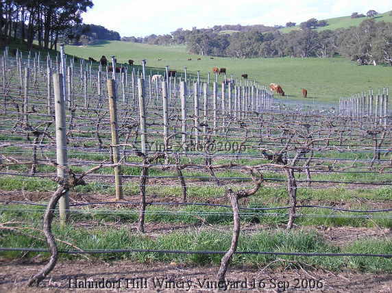 这是Riesling片的葡萄园,修剪的还是很严重的。我数了一下,只留了20个节。这里的气候,比waite的确要凉一些,校区里的Riesling现在都已经可见花序,抽枝了;而这里芽都还没爆出。这里的产量也特别的低,据介绍,只有5.5吨/公顷。他们一是通过修剪,另一是在花期疏掉部分的花序。