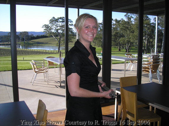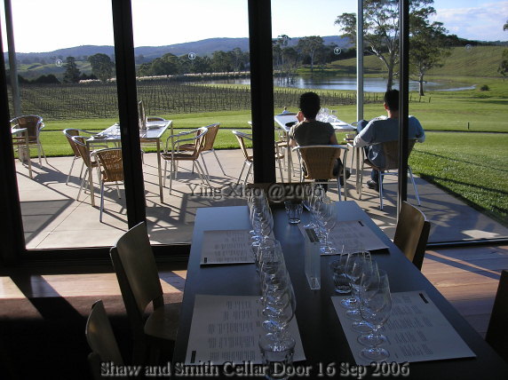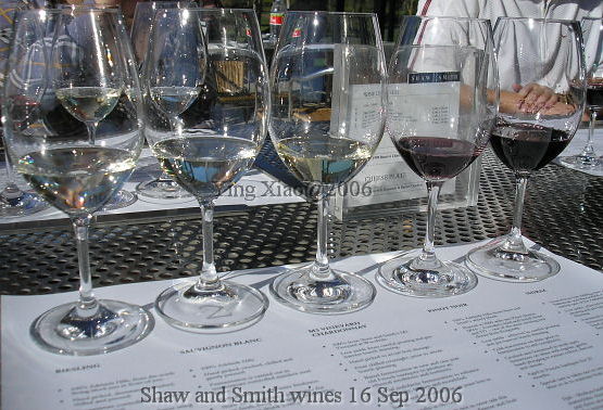 第一款试的Rose。接待先生说,他们做的是Dry Rose。闻杯中的味道,我感觉是类似Riesling经常遇到的风味,因为糖分低,酸度就有些凸现出来,但却不敛口。Sauvignon Blanc飘着辛辣味,朋友更准确的描述道是青椒的味道。Chardonnay虽然是橡木桶发酵,然而橡木味却并不主导,而是尽量保持多的水果的香气。这里的Shiraz没有像一般的shiraz那样重的口感,虽然新,但单宁不很涩口。这是我所记得的一些感受。: )