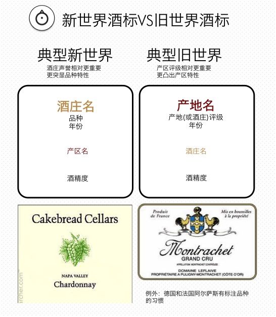 如果想要迅速识别新世界或旧世界酒的话,一种办法是靠地理(新世界是美洲和南半球——新兴葡萄酒生产国,旧世界是欧洲大陆——传统葡萄酒生产国),另一种办法是看酒标的整体感觉。