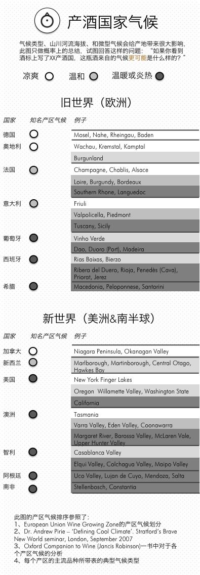 对于目前来说,只需知道新世界国家的气候普遍偏热,旧世界国家的气候普遍偏冷。气候的原因部分导致了新世界的酒偏浓郁、有更多偏甜香的果味;旧世界的酒偏酸、有更多偏咸香的非果味。