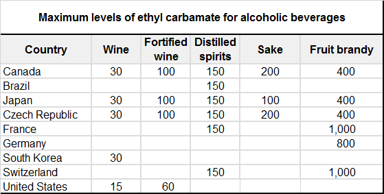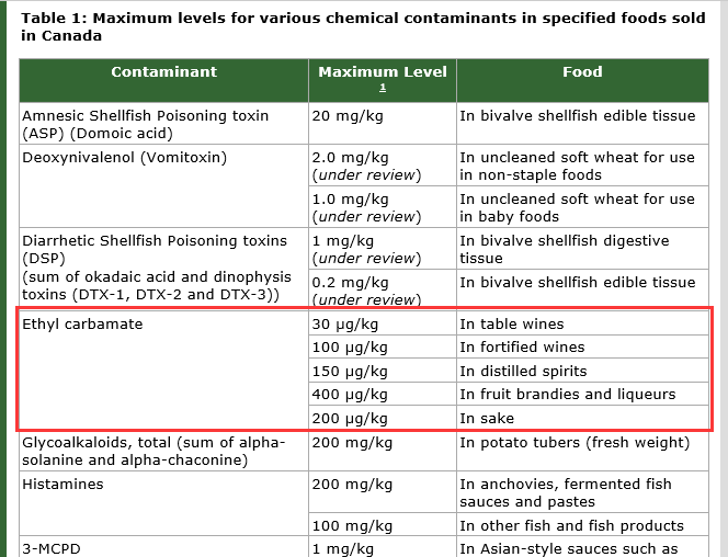 上图是我整理的一些国家对酒类中EC含量的限量标准。单位(?g/L)