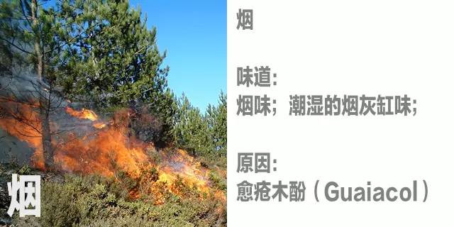 葡萄带有蜡质的果皮能沾染烟尘颗粒,烟尘颗粒中含有愈疮木酚。加利福尼亚州安德森山谷(Anderson Valley)2008年森林大火后出产的很多黑皮诺葡萄酒带有烟味。